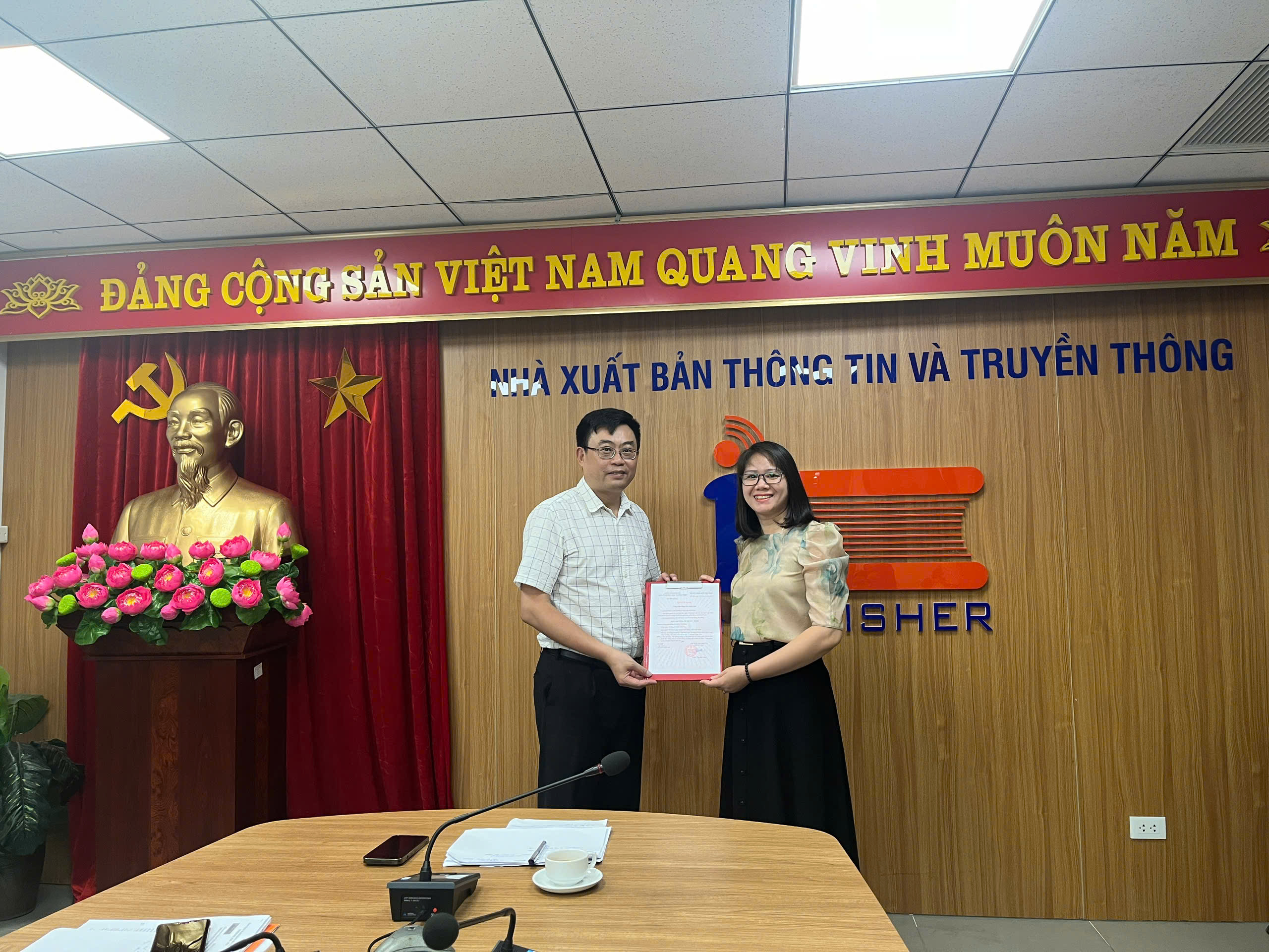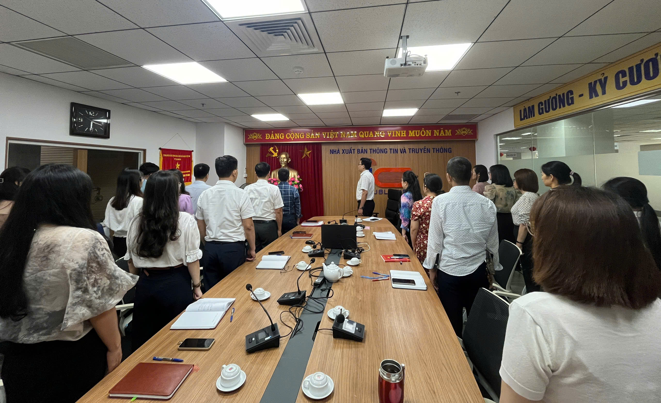 Sáng ngày 01/8/2025, Nhà xuất bản Thông tin và Truyền thông (NXB TTTT) đã trang trọng tổ chức lễ chào cờ đầu tháng – một hoạt động thường kỳ nhằm khơi dậy tinh thần yêu nước, ý thức trách nhiệm và đoàn kết trong toàn thể cán bộ viên chức. Buổi lễ diễn ra tại trụ sở chính (tầng 6, tòa nhà 115 Trần Duy Hưng, Hà Nội) và được kết nối trực tuyến tới hai chi nhánh TP. Hồ Chí Minh và Miền Trung - Tây Nguyên.