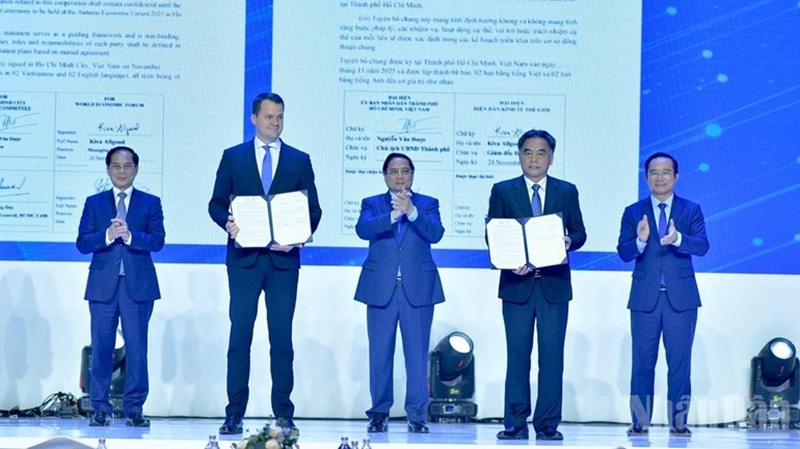 Thủ tướng Phạm Minh Chính chứng kiến lễ trao Biên bản ghi nhớ giữa Thành phố Hồ Chí Minh với Diễn đàn Kinh tế thế giới. (Ảnh: THANH GIANG)