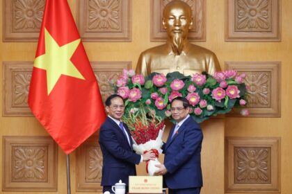 Thủ tướng Phạm Minh Chính chúc mừng Bộ trưởng Bùi Thanh Sơn được bổ nhiệm giữ chức Phó Thủ tướng Chính phủ (ảnh: VGP/Nhật Bắc).