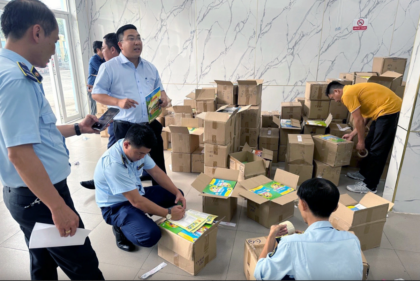 Lực lượng quản lý thị trường kiểm tra, tạm giữ hơn 33.000 sách giáo khoa các loại có dấu hiệu giả mạo nhãn hàng hóa Nhà xuất bản Giáo Dục Việt Nam – Ảnh: CTV