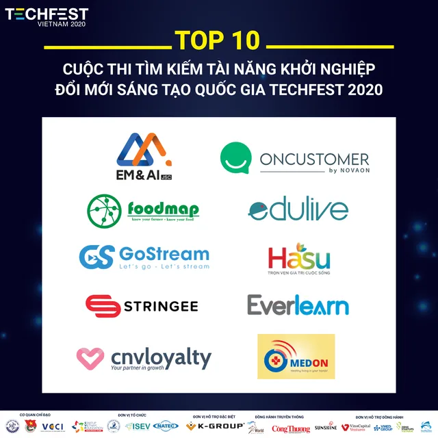 27-11-2020.Quán quân cuộc thi sẽ nhận được tổng giá trị giải thưởng lên đến 200 triệu đồng giá trị và trở thành đại diện Việt Nam tham dự cuộc thi khởi nghiệp Startup World Cup 2021 với giải thưởng trị giá 01 triệu Đô la Mỹ.Trải qua 3 vòng thi căng thẳng, cuộc thi tìm kiếm tài năng khởi nghiệp nằm trong khuôn khổ TECHFEST 2020 với chủ đề "Thích ứng - Chuyển đổi - Bứt phá" đã chọn ra 10 đội có kết quả đánh giá cao nhất bởi hội đồng hơn 60 chuyên gia và nhà đầu tư trong nước và quốc tế.Top 10 vào Chung kết Techfest 2020 bao gồm: Foodmap (công nghệ ẩm thực); Gostream (nền tảng livestream); Stringee (công nghệ giao tiếp); Med-on (công nghệ y tế); MVV Everlearn (công nghệ giáo dục) ; OnCustomer (nền tảng giao tiếp khách hàng); EM&AI (công nghệ trí tuệ nhân tạo); Edulive (công nghệ giáo dục) ; CNV Loyalty (chăm sóc khách hàng); HASU Toàn Cầu (nền tảng ứng dụng sức khỏe, học tập, giải trí cho người lớn).Lộ diện 10 startup vào vòng Chung kết Techfest 2020 - Ảnh 1.Vòng chung kết sẽ diễn ra vào sáng ngày 29/11, tại Hội trường A2, Tòa A2, ĐH Kinh tế Quốc dân, Hà Nội.Hội đồng Ban giám khảo Chung kết sẽ có sự tham gia của các nhà đầu tư, các chuyên gia khởi nghiệp, đổi mới sáng tạo đại diện nổi tiếng và nhiều kinh nghiệm: Ông Richard Han - Phó Chủ tịch Qũy đầu tư VinaCapital Ventures; Ông Phạm Thanh Hưng - Phó chủ tịch hội đồng quản trị CEN Group; Ông Nguyễn Hòa Bình - Chủ tịch Tập đoàn NextTech; Bà Nguyễn Bảo Linh - Thành viên sáng lập One Mount Group; Ông Nguyễn Duy Khanh - Tổng giám đốc Công ty Cổ phần K-GROUP Việt Nam; Ông Nguyễn Huy Minh - Tổng giám đốc SunShine Holding; Ông Nguyễn Mạnh Dũng - Đối tác quản lý tại Do Ventures; Ông Martin Kim - Giám đốc Shinhan Futures Lab Vietnam; Ông Olivier Raussin - Đối tác quản lý tại FEBE Ventures.Lộ diện 10 startup vào vòng Chung kết Techfest 2020 - Ảnh 2.ADVERTISING