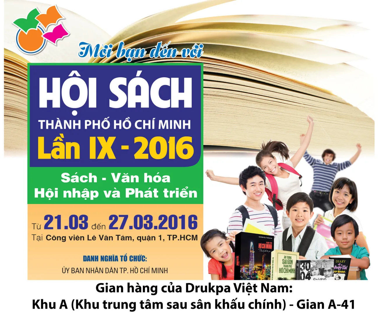 GIAN HÀNG SÁCH DRUKPA VIỆT NAM.Chương trình hoạt động & khuyến mại tại Hội sách Tp HCM 3/2016.Thời gian: từ ngày 21 - 27/3/2016.Địa điểm: Công viên Lê Văn Tám, Võ Thị Sáu, Q 1, Tp HCM.Vị trí gian hàng: Khu A – Gian hàng A-41 (Tại khu Trung tâm công viên, ngay sau sân khấu chính).Hội sách Tp Hồ Chí Minh được tổ chức định kỳ 2 năm một lần đã trở thành “điểm hẹn” văn hóa thu hút hàng triệu bạn đọc và giới làm sách cả nước tham gia.Tại hội sách năm nay, Công ty sách Drukpa Việt Nam mang đến hàng chục ấn phẩm giá trị về nghệ thuật sống, cùng số lượng lớn quà tặng độc đáo là những chiếc túi thủ công thêu hoa, đính cườm xinh xắn được nhập về từ Nepal.* Chương trình khuyến mại.- Tặng 300 cuốn sách “Hóa gải stress” trong ngày đầu khai mạc Hội sách.- Tặng túi thủ công vải gấm (sản phẩm nhập từ Nepal) cho hóa đơn 300.000 đồng.- Giảm giá sách từ 10% - 40% đối với các ấn phẩm tuyển in trong tủ sách Sống Hạnh Phúc.* Những ấn phẩm giá trị.- Hành trình tâm linh siêu việt, Giác ngộ mỗi ngày, Hạnh phúc tại tâm, Tâm an lạc., là những đầu sách về nghệ thuật sống theo triết lý đạo Phật, với tác giả là Đức Pháp Vương Gyalwang Drukpa (Ấn Độ), Nhiếp Chính Vương Gyalwa Dokhampa (Bhutan), các bậc Thầy thực chứng đạo hạnh của Truyền thừa Drukpa.- ;Sách được phát hành toàn cầu qua mạng Amazon và được dịch, xuất bản tại nhiều nước trên thế giới: Anh, Pháp, Mỹ, ;Ấn Độ, Trung Quốc, Mexico, Bhutan.- Bộ sách “Bardo- Bí mật nghệ thuật sinh tử” và “Bardo - Hành trình liễu sinh thoát tử” thuộc thể loại sách khoa học hướng nội vén lộ tấm màn bí mật che phủ về thực tại của đời sống, giấc mộng, cái chết, tiến trình chuyển tiếp đằng sau cái chết và sự tái sinh.Bardo thu hút sự quan tâm của nhiều độc giả cả nước ngay trong lần đầu xuất bản (Nxb Tôn Giáo, năm 2012).Đức Pháp Vương Gyalwang Drukpa: "Hạnh phúc là bản chất của bạn"