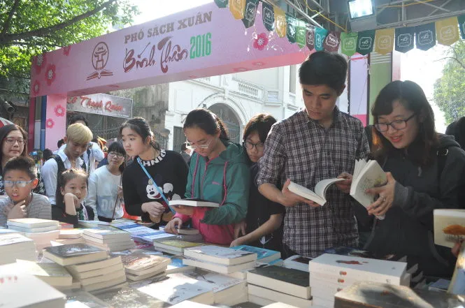 TT - Lần đầu tiên được tổ chức nhưng tính đến ngày 13-2, phố sách xuân Bính Thân 2016 tại phố Lê Thạch, Hà Nội đạt doanh thu hơn 4 tỉ đồng, với gần 100.000 bản sách được bán ra.Đông đảo độc giả xem và mua sách tại phố sách xuân lần đầu tổ chức tại Hà Nội - Ảnh: V.V.Tuân