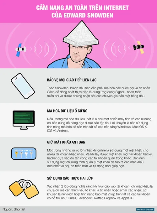 Khi truy cập internet, dữ liệu trên thiết bị của bạn có thể đang nằm trong tầm ngắm của bất kỳ ai: từ các hacker, những kẻ phá hoại đến cả chính phủ.Do đó, bạn nên trang bị cho mình những kiến thức cơ bản.Theo Business Insider, trong cuộc phỏng vấn với The Intercept, Edward Snowden (cựu nhân viên kỹ thuật CIA của Mỹ) đã đưa ra một vài cách đơn giản nhưng hiệu quả để mọi người có thể bảo vệ thông tin cá nhân trước đầy rẫy những hiểm họa trên internet.Những lời khuyên của Edward Snowden giúp bảo vệ thông tin cá nhân tốt hơn.Ảnh Việt hóa từ Business Insider.Thanh Tâm