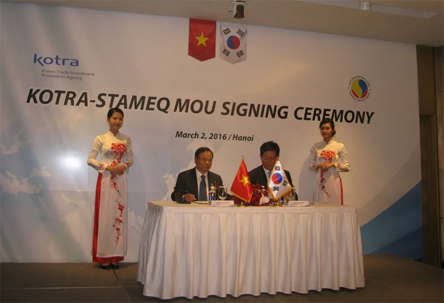 Nhằm tăng cường hợp tác giữa Việt Nam - Hàn Quốc, sáng ngày 2/3/2016 đã diễn ra lễ kết kết giữa Tổng cục Tiêu chuẩn Đo lường Chất lượng và KOTRA.Năm 2015 đánh dấu sự kiện quan trọng khi Chính phủ Việt Nam và Hàn Quốc đã chính thức ký kết Hiệp Định Thương mại Tự do (FTA).Trong thời gian qua, Cơ quan Xúc tiến Đầu tư - Thương mại Hàn Quốc (KOTRA), Viện Tiêu chuẩn Kỹ thuật Hàn Quốc (KATS) và Tổng cục Tiêu chuẩn Đo lường Chất lượng (STAMEQ) đã phối hợp trao đổi về việc ba bên cùng hợp tác chặt chẽ nhằm hỗ trợ và tạo điều kiện thuật lợi cho các doanh nghiệp Hàn Quốc trong việc đăng ký hợp quy CR trong quá trình xuất khẩu hàng hóa sang Việt Nam.Trên tinh thần đó, nhằm tăng cường sự hợp tác cụ thể giữa hai bên trong thời gian tới, vào ngày 02/03 tại Hà Nội, Tổng cục Tiêu chuẩn Đo lường Chất lượng (STAMEQ) và Cơ quan Xúc tiến Đầu tư - Thương mại Hàn Quốc (KOTRA) đã ký Biên bản ghi nhớ về việc hợp tác trong lĩnh vực tiêu chuẩn hóa, quy chuẩn kỹ thuật, đo lường, đánh giá sự phù hợp và mã số, mã vạch.Tham gia lễ kí kết có ông Trần Văn Vinh - Tổng cục trưởng Tổng cục TCĐLCL, ông Jaehong Kim -Chủ tịch KOTRA, lãnh đạo Bộ KH&CN, Bộ Công thương, Phòng Thương mại và Công nghiệp Việt Nam, Đại sứ Hàn Quốc tại Việt Nam cùng đại diện các cơ quan liên quan giữa hai nước.Được thành lập vào năm 1962, KOTRA được Chính phủ nước Cộng hòa Hàn Quốc điều hành như một cơ quan của Chính phủ với chức năng là thúc đẩy thương mại, kinh doanh và đầu tư ở nước ngoài, cung cấp các hoạt động nghiên cứu,triển khai và hỗ trợ các đối tác trên toàn cầu.Theo biên bản ghi nhớ, hai bên thống nhất hợp tác và triển khai các hoạt động chung trong lĩnh vực tiêu chuẩn hóa, đo lường, quy chuẩn kỹ thuật, đánh giá sự phù hợp và mã số, mã vạch vì mục đích tăng cường cải tiến kỹ thuật, hiểu biết chung về pháp quy để thúc đẩy việc kinh doanh và thương mại giữa hai bên.Trong khuôn khổ buổi sáng cùng ngày là lễ cắt băng khánh thành khai trương trung tâm Hỗ trợ FTA Hàn Việt.Trung tâm được thành lập nhằm quảng bá nội dung hiệp định FTA Hàn Việt (chính thức có hiệu lực từ 20/12/2015) và giúp đỡ doanh nghiệp hai nước vận dụng hiệu quả FTA vừa kí kết, thức đẩy giao dịch thương mại và đầu tư giữa Hàn Quốc và Việt Nam.Trong bối cảnh kinh tế toàn cầu chứng kiến sự sụt giảm về tốc độ tăng trưởng trong những năm vừa qua, kéo theo tình hình xuất khẩu của các doanh nghiệp trên thế giới bị chững lại, ông Kim Jae Hong - Chủ tịch KOTRA nhận định “Trung tâm Hỗ trợ FTA Hàn -Việt được kì vọng sẽ là nơi hỗ trợ doanh nghiệp vận dụng linh hoạt FTA Hàn-Việt để tạo đà tăng trưởng cho các hoạt động xuất khẩu của doanh nghiệp đi đến các thị trường Trung Quốc,Mỹ, Châu Âu vốn đã bị suy thoái trong thời gian qua.&rdquo.Trả lời phỏng vấn bên lề buổi lễ, ông Trần Văn Vinh - Tổng cục trưởng STAMEQ cho biết: “Trường hợp các doanh nghiệp Việt Nam muốn xuất khẩu sang Hàn Quốc có thể liên hệ, cung cấp thông tin cho STAMEQ.Sau đó STAMEQ sẽ có những sự hỗ trợ , tạo điều kiện, làm rõ những yêu cầu quy định ở Hàn Quốc, trên cơ sở đó doanh nghiệp sẽ tiếp cận được những thông tin cần thiết giúp tiết kiệm thời gian, chi phí và không bị bỡ ngỡ khi tiến hành xuất khẩu sang Hàn Quốc.&rdquo.Dưới đây là một số hình ảnh tại sự kiện: