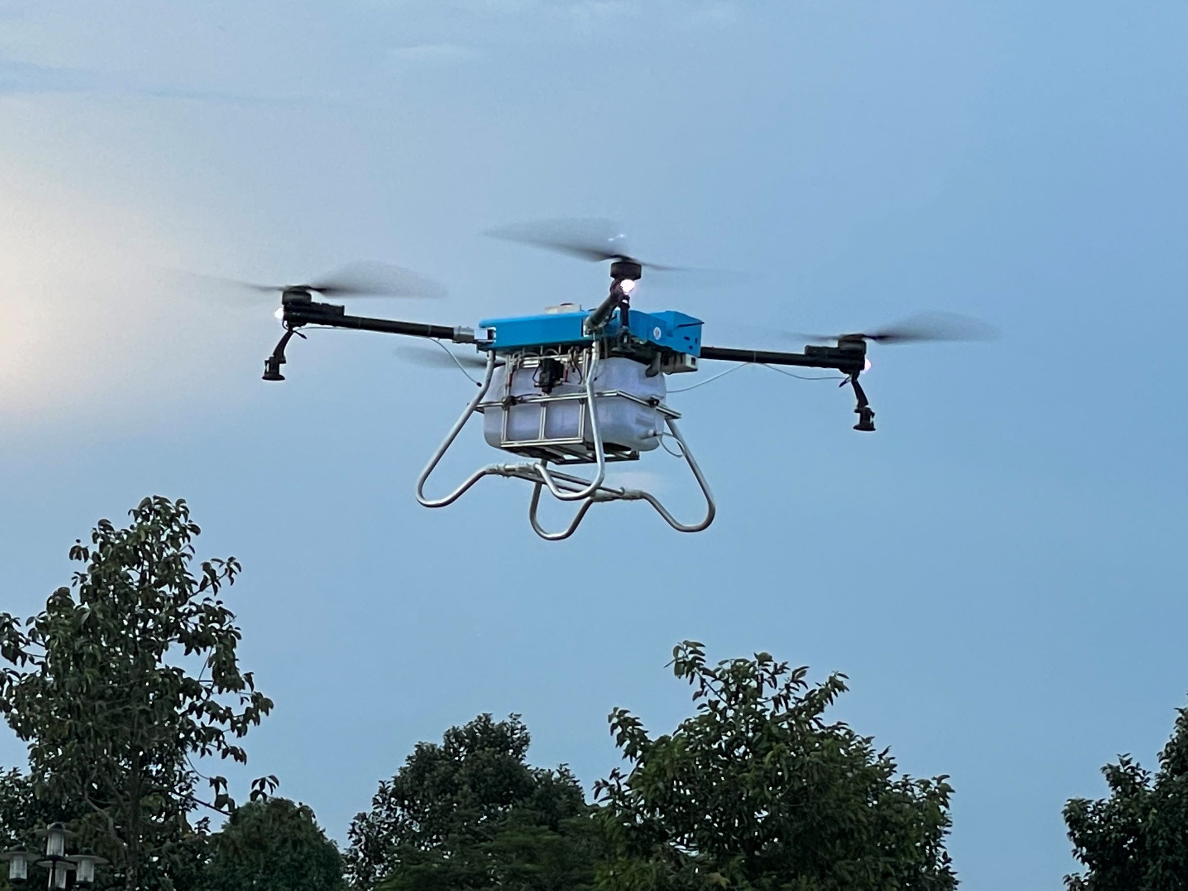 Máy bay không người lái phun thuốc trừ sâu do giảng viên và sinh viên Đại học Sư phạm Kỹ thuật TP HCM chế tạo, tháng 10/2023. Ảnh: Hà An