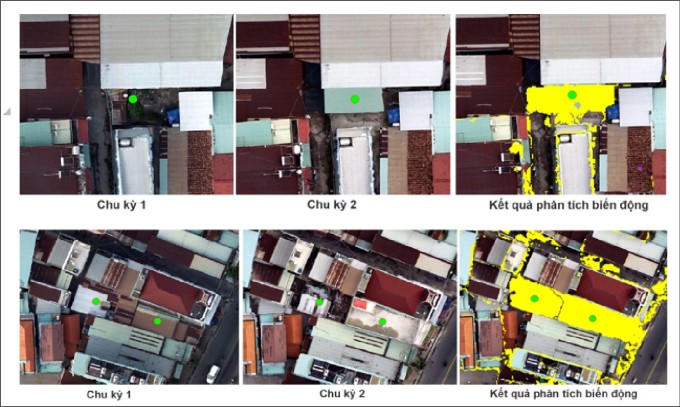 Sự thay đổi công trình xây dựng thể hiện bằng chấm xanh giữa hai chu kỳ ảnh chụp không ảnh bằng UAV giúp cơ quan quản lý xác định vi phạm trật tự xây dựng. Ảnh: Nhóm dự án