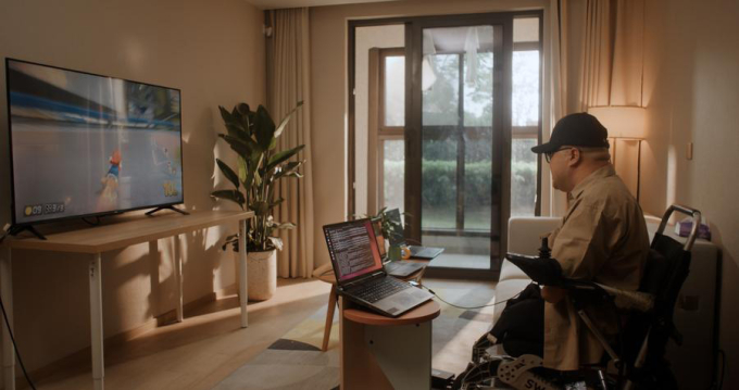 Bệnh nhân liệt tứ chi chơi game đua xe bằng suy nghĩ sau ca phẫu thuật cấy ghép thiết bị giao diện não - máy tính (BCI) vào não tại Thượng Hải. Ảnh: CEBSIT/CAS/Xinhua