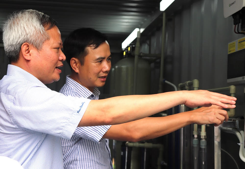 Thứ trưởng Bộ KH&CN Bùi Thế Duy trao đổi về tính năng của hệ thống lọc nước.