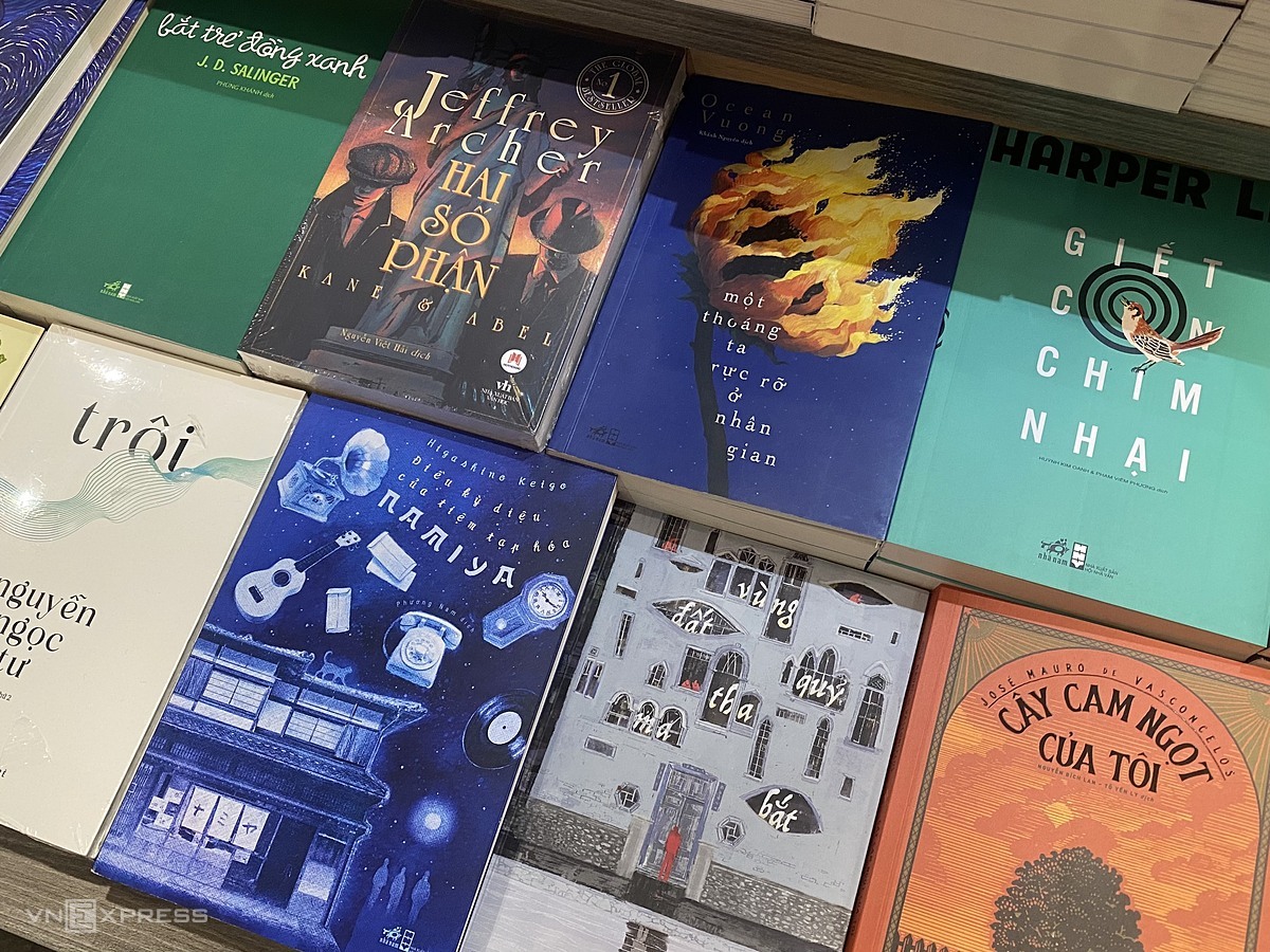 Một số tác phẩm trên kệ sách bán chạy của một nhà sách ở TP HCM, ngày 7/5. Ảnh: Quế Chi