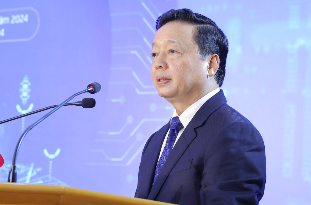 Bộ trưởng Thông tin và Truyền Thông Nguyễn Mạnh Hùng phát biểu về nhân lực bán dẫn tại hội nghị, sáng 4/5. Ảnh: BTC